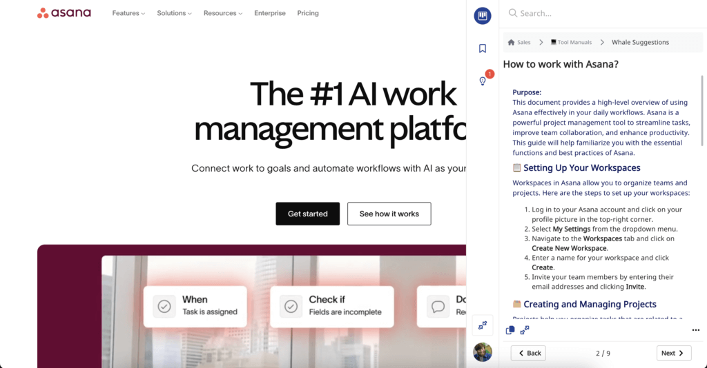 By integrating Whale’s suggestions with Asana via our Chrome and Microsoft Extensions, you can ensure that your team has immediate access to the right information at the right time. This reduces the need for unnecessary questions, enhances productivity, and supports the consistency of your company’s processes.
