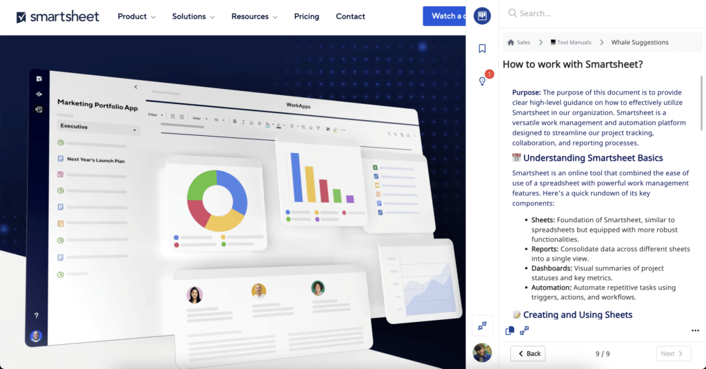 By integrating Whale’s suggestions with Smartsheet via our Chrome and Microsoft Extensions, you can ensure that your team has immediate access to the right information at the right time. This reduces the need for unnecessary questions, enhances productivity, and supports the consistency of your company’s processes.